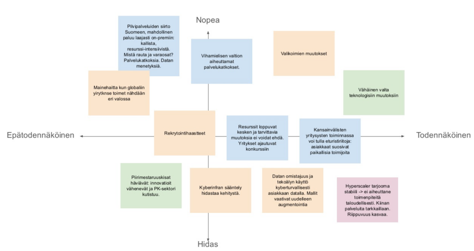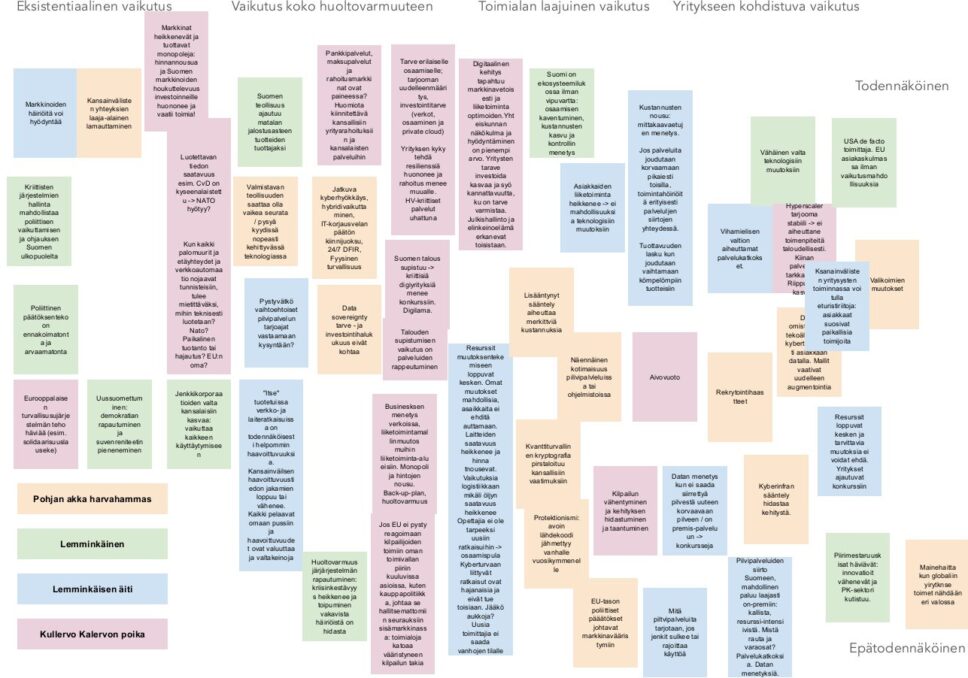 Työpajassa ryhmät tunnistivat skenaarioiden perusteella todennäköisiä ja epätodennäköisiä riskejä, joilla on koko yhteiskunnan laajuisia, huoltovarmuuteen liittyviä, toimialaan liittyviä tai yksittäisiin yrityksiin liittyviä vaikutuksia.