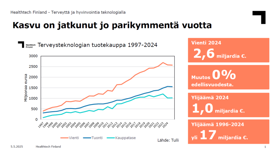 Terveysteknologian viennin ylijäämä viime vuonna oli edelleen miljardi euroa. Parikymmenen viime vuoden aikana alan yli 17 miljardin ylijäämä on luonut työpaikkoja ja panostuksia niin kehitystyöhön kuin teollisiin investointeihin.