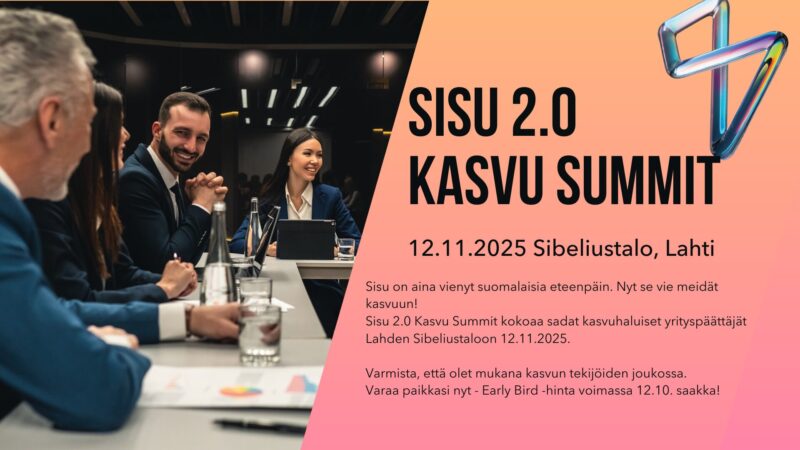 12 marraskuuta 2025 Lahden Sibeliustalo muuttuu foorumiksi sadoille yrityspäättäjille, jotka kokoontuvat ratkomaan suomalaisen liiketoiminnan kasvun haasteita. Kasvu Summit tarjoaa ratkaisuja aikamme isoimpiin haasteisiin, inspiroivia ideoita kestävään kasvuun ja verkostoitumista.