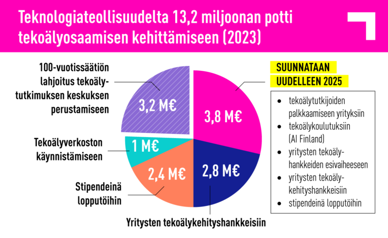 Teknologiateollisuus ry päätti marraskuussa 2023 kymmenen miljoonan euron investoinnista tekoälyn hyödyntämisen vauhdittamiseen Suomessa. Panostuksen tavoitteena on lisätä tekoälyn käyttöönottoa ja kehittämistä suomalaisissa teknologiayrityksessä, vahvistaa soveltavaa tutkimusta sekä houkutella tekoälyosaajia Suomeen.