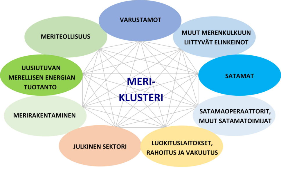 Merellisten elinkeinojen muodostamaa kokonaisuutta kutsutaan meriklusteriksi. Siihen kuuluvat meriteollisuuden ohella varustamot, satamat ja satamaoperaattorit sekä muut meriklusteria tukevat toiminnot.