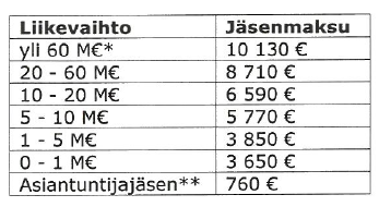 PIA:n jäsenmaksut on sidottu yrityksen liikevaihtoon oheisen taulukon mukaisesti.