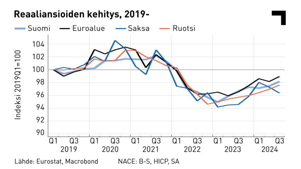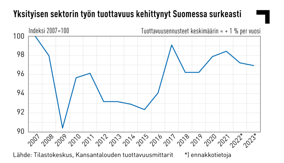 Jos tuottavuutta käyttäisi keskeisimpänä mittarina ostovoiman kasvun perustelemiseen, pitäisi suomalaisten ostovoiman olla itse asiassa tällä hetkellä muutaman prosentin alempana kuin mitä se oli vuonna 2007. Tuottavuuskasvu on ollut Suomessa Euroopan heikoimpia, ja tämä näkyy myös BKT-vertailuissa. Tästä seuraa, että Suomessa reaalipalkkojen nousuvara on Euroopan pienimpiä. Suomen tuottavuuskasvu on ollut olematonta myös koronakriisin jälkeisinä vuosina.