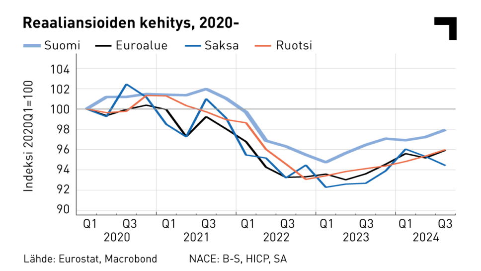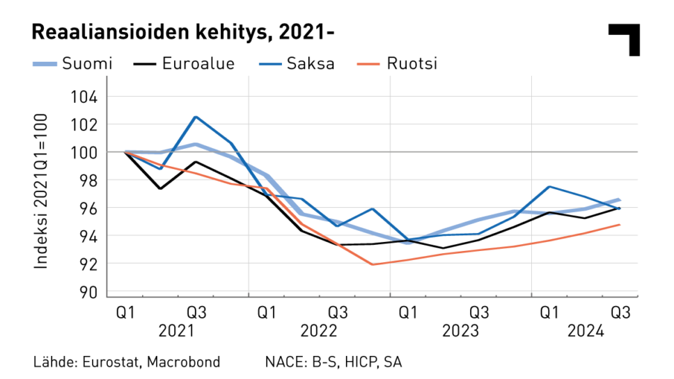 Suomessa ostovoima on siis kehittynyt samaa tahtia eurooppalaisten verrokkien kanssa, mutta ilman, että kehitykselle olisi vankka pohja taloudellisen suoriutumisen perusteella.