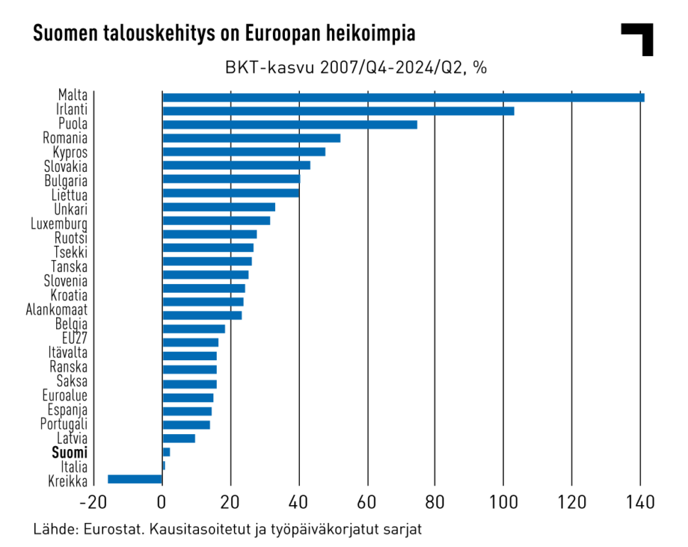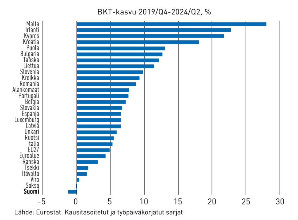Katsotaan vielä kerran, millaisissa olosuhteissa palkkaratkaisua haetaan. Aloitetaan vertailemalla Suomen talouskasvua muihin Euroopan maihin.